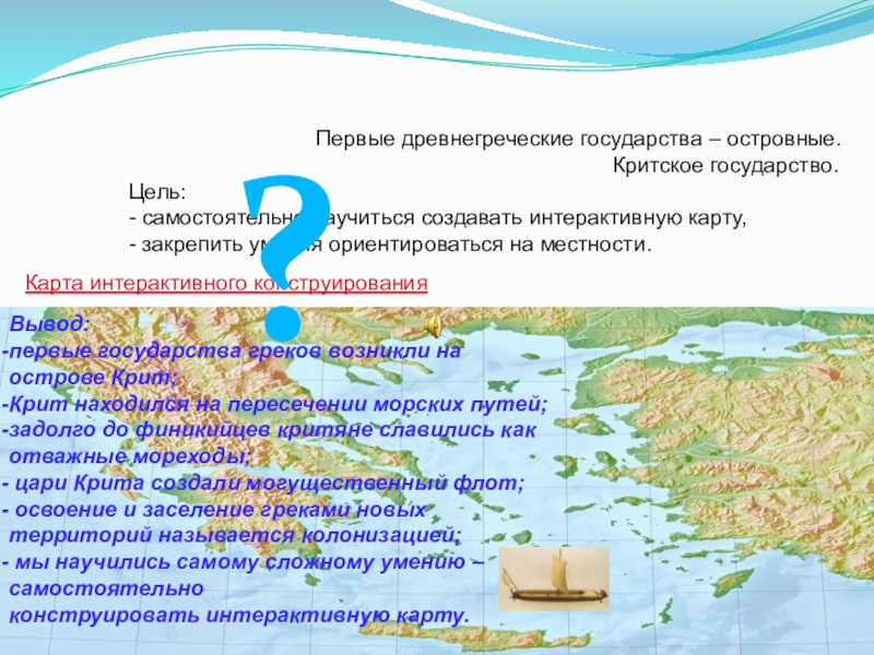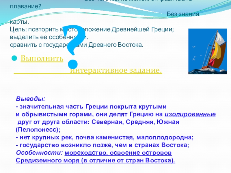 Особенности: мореходство, освоение островов Средиземного моря (в отличие от стран Востока).