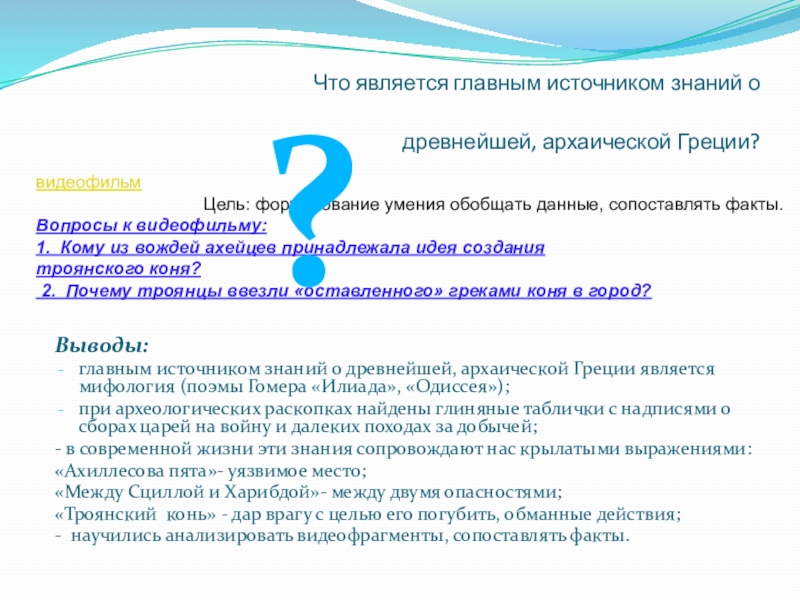 главным источником знаний о древнейшей, архаической Греции является мифология (поэмы Гомера «Илиада», «Одиссея»);
