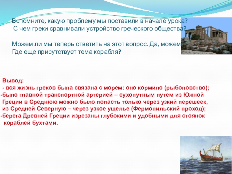 - вся жизнь греков была связана с морем: оно кормило (рыболовство);
