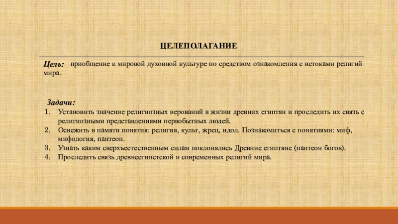приобщение к мировой духовной культуре по средством ознакомления с истоками религий мира.