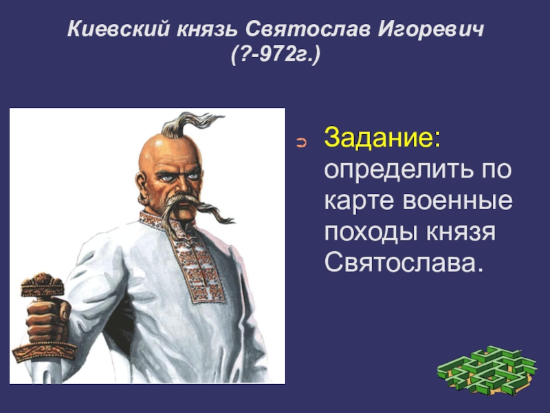 Киевский князь Святослав Игоревич (?-972г.)‏Задание: определить по карте военные походы князя Святослава.