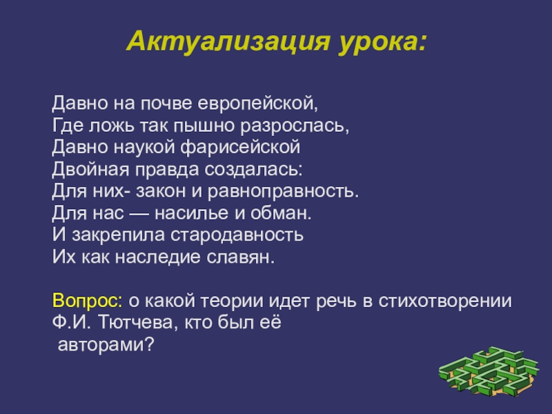 Актуализация урока:Давно на почве европейской, Где ложь так пышно разрослась,Давно наукой фарисейскойДвойная правда создалась:Для них- закон и