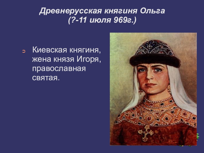 Древнерусская княгиня Ольга (?-11 июля 969г.)‏Киевская княгиня, жена князя Игоря, православная святая.