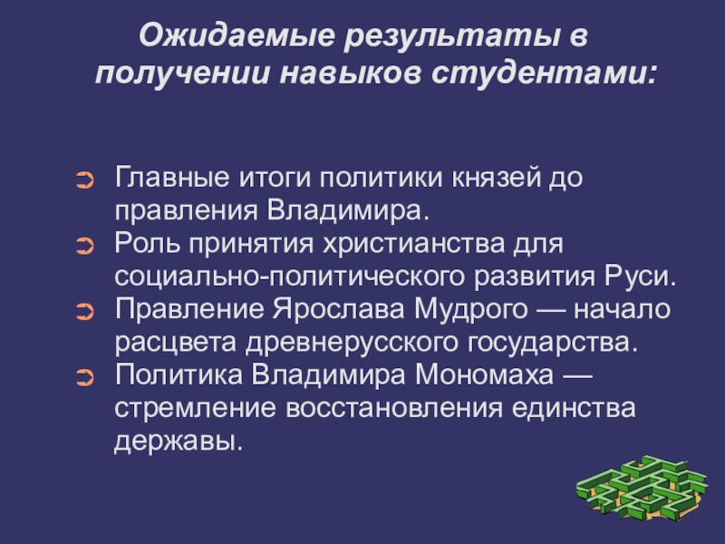 Ожидаемые результаты в получении навыков студентами:Главные итоги политики князей до правления Владимира.Роль принятия христианства для социально-политического развития