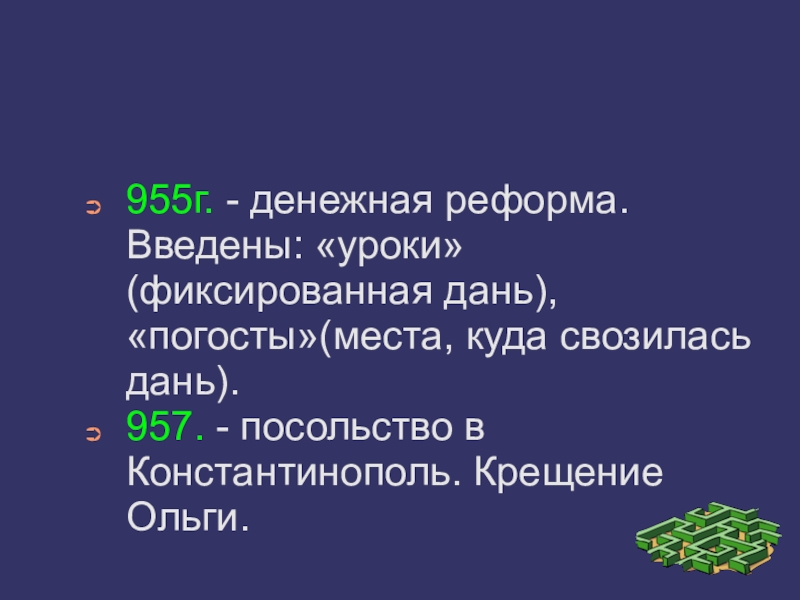 955г. - денежная реформа. Введены: «уроки»(фиксированная дань), «погосты»(места, куда свозилась дань).957. - посольство в Константинополь. Крещение Ольги.