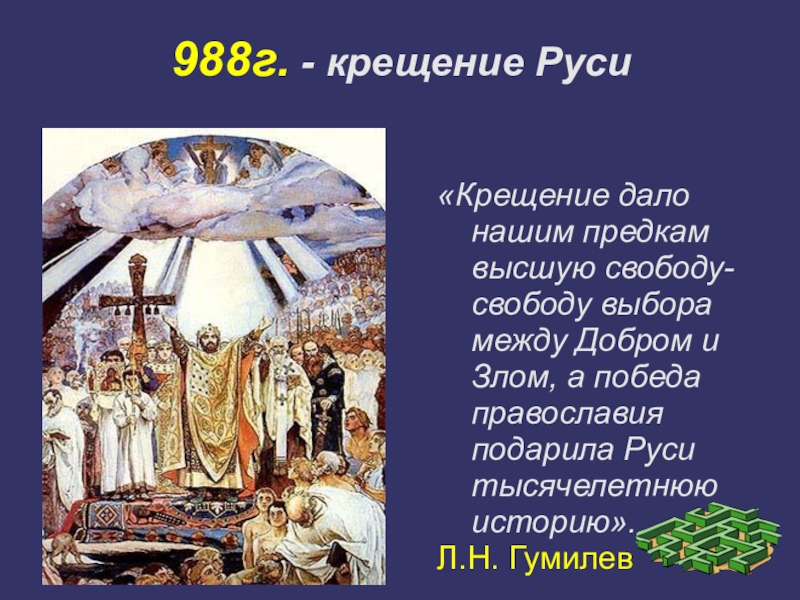 988г. - крещение Руси«Крещение дало нашим предкам высшую свободу-свободу выбора между Добром и Злом, а победа православия