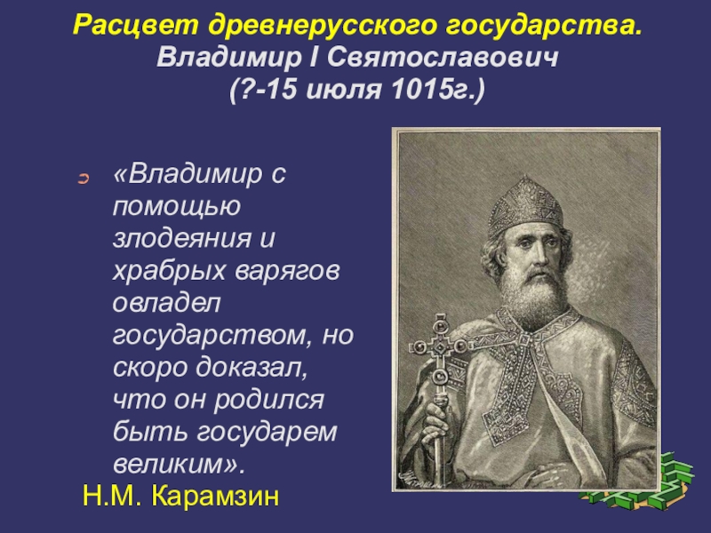 Расцвет древнерусского государства.Владимир I Святославович (?-15 июля 1015г.)‏«Владимир с помощью злодеяния и храбрых варягов овладел государством, но