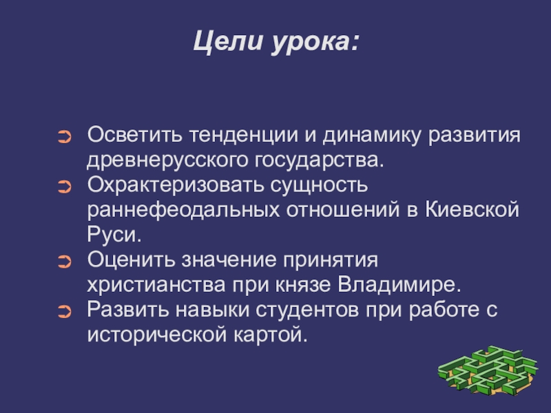 Цели урока:Осветить тенденции и динамику развития древнерусского государства.Охрактеризовать сущность раннефеодальных отношений в Киевской Руси.Оценить значение принятия христианства при князе Владимире.Развить навыки студентов при работе с исторической картой.
