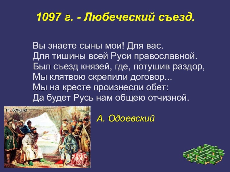 1097 г. - Любеческий съезд.Вы знаете сыны мои! Для вас.Для тишины всей Руси православной. Был съезд князей,
