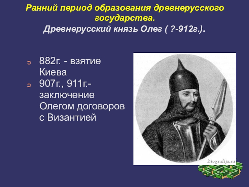 Ранний период образования древнерусского государства.Древнерусский князь Олег ( ?-912г.).882г. - взятие Киева907г., 911г.- заключение Олегом договоров с