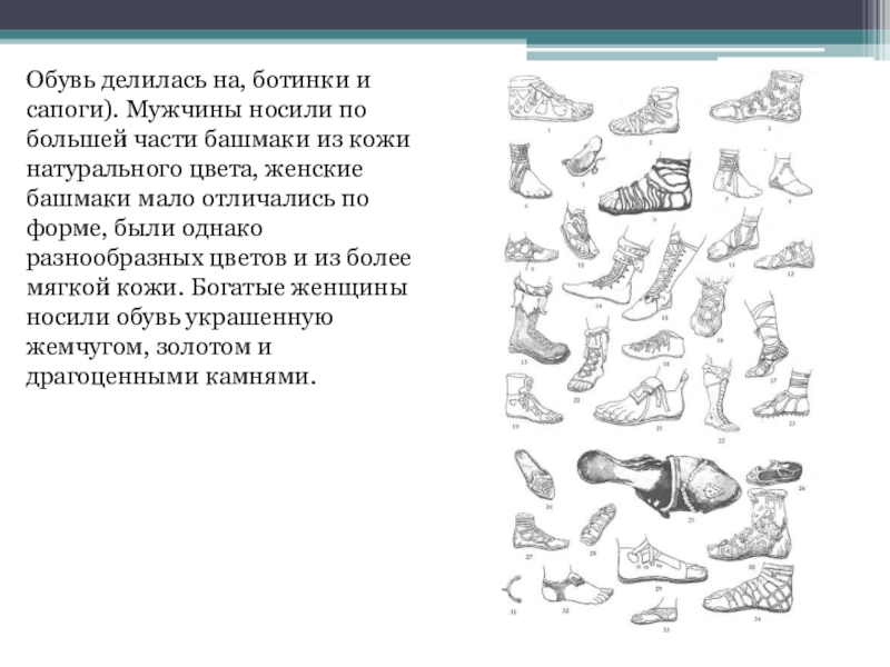 Слайд 14Обувь делилась на, ботинки и сапоги). Мужчины носили по большей части