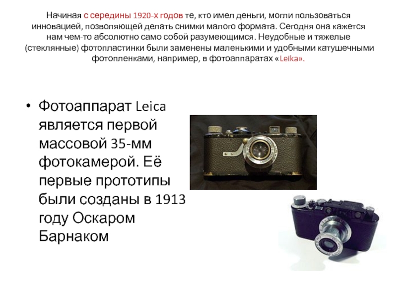 Фотоаппарат Leica является первой массовой 35-мм фотокамерой. Её первые прототипы были созданы в 1913 году Оскаром Барнаком