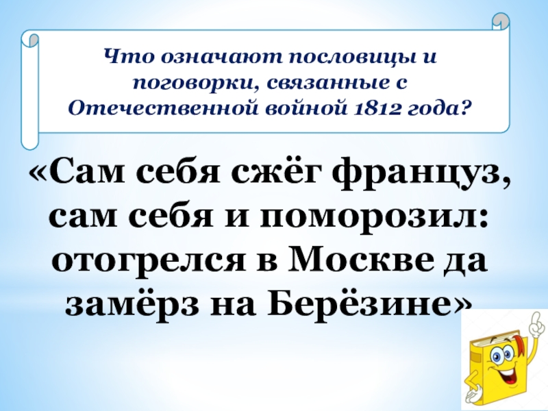 Слайд 27Что означают пословицы и поговорки, связанные с Отечественной войной 1812 года?