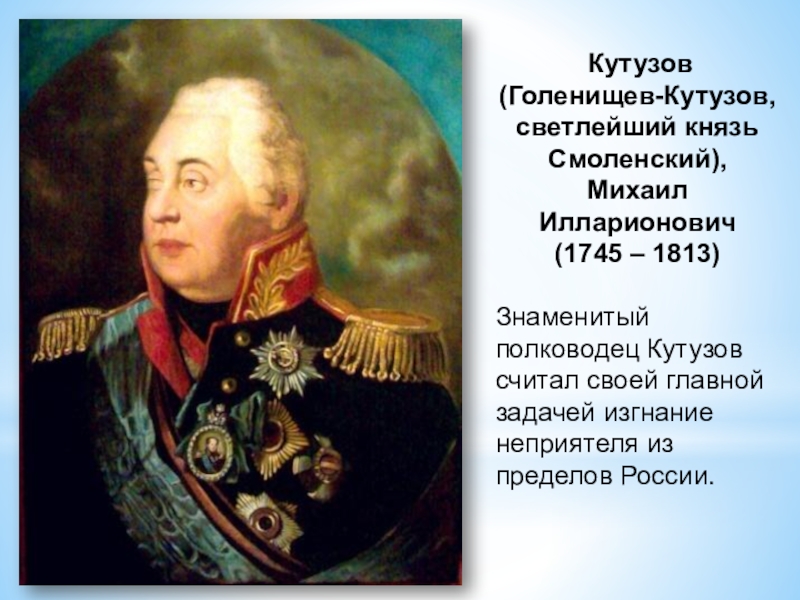 Знаменитый полководец Кутузов считал своей главной задачей изгнание неприятеля из пределов России.
