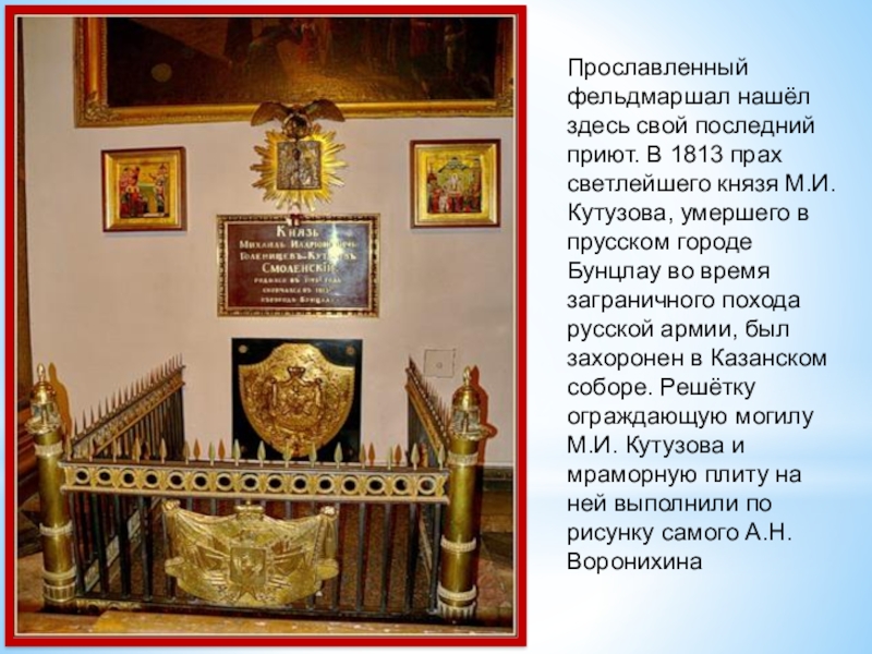 князя М.И.Кутузова, умершего в прусском городе Бунцлау во время заграничного похода русской армии, был захоронен в Казанском соборе. Решётку ограждающую могилу М.И. Кутузова и мраморную плиту на ней выполнили по рисунку самого А.Н.Воронихина