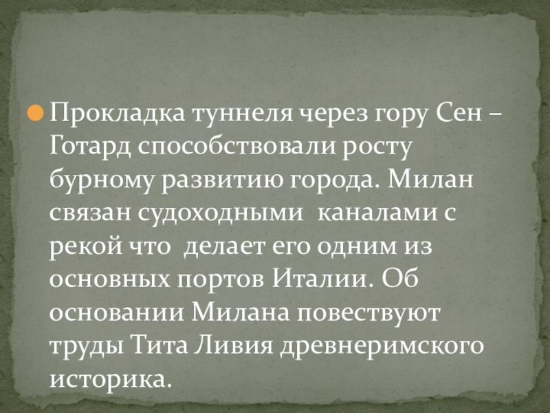 города. Милан связан судоходными каналами с рекой что делает его одним из основных портов Италии. Об основании Милана повествуют труды Тита Ливия древнеримского историка.