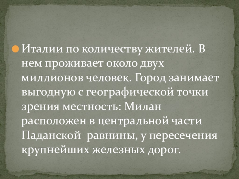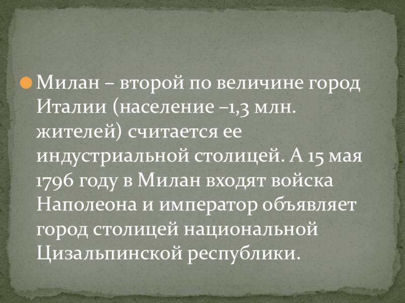 Слайд 3Милан – второй по величине город Италии (население –1,3 млн. жителей)