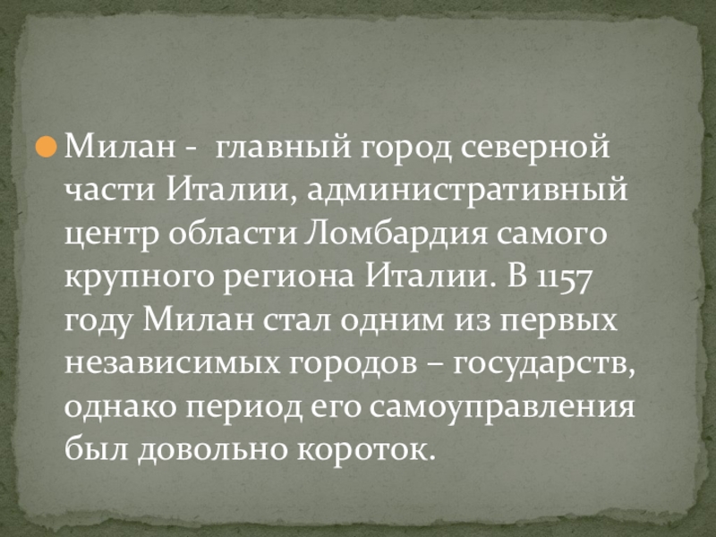самого крупного региона Италии. В 1157 году Милан стал одним из первых независимых городов – государств, однако период его самоуправления был довольно короток.
