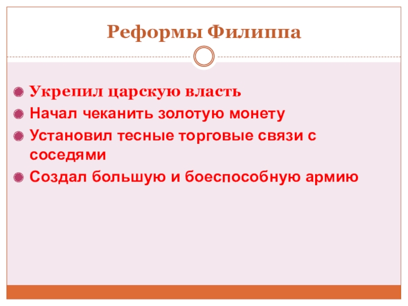 Реформы Филиппа Укрепил царскую властьНачал чеканить золотую монетуУстановил тесные торговые связи с соседямиСоздал большую и боеспособную армию
