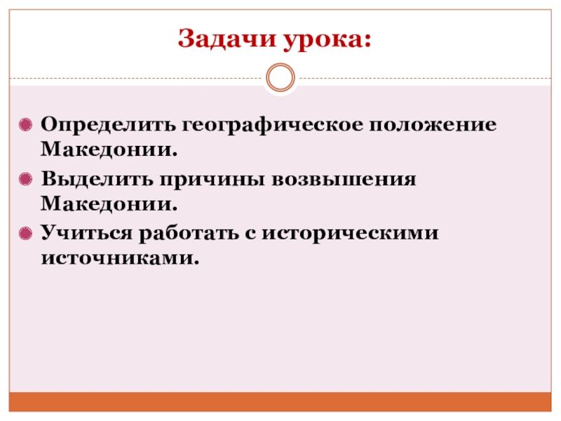 Задачи урока:Определить географическое положение Македонии.Выделить причины возвышения Македонии.Учиться работать с историческими источниками.