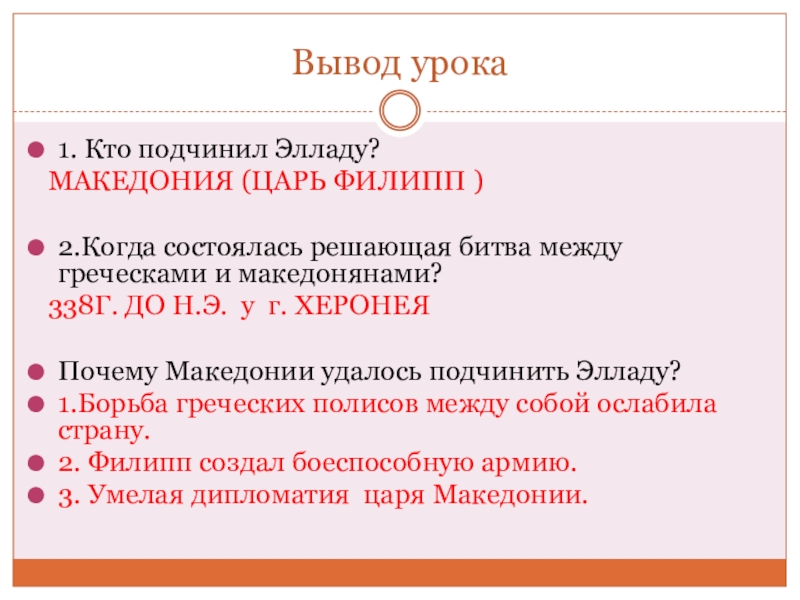 Вывод урока1. Кто подчинил Элладу?    МАКЕДОНИЯ (ЦАРЬ ФИЛИПП ) 2.Когда состоялась решающая битва между