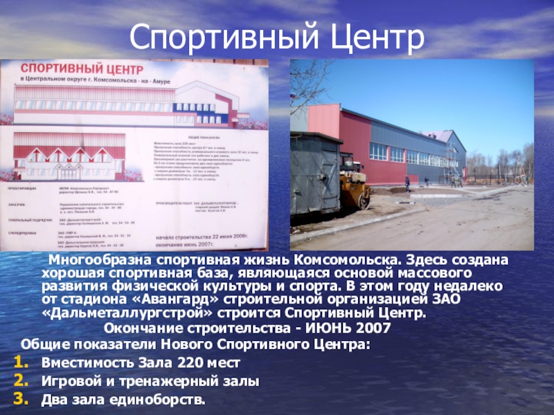 основой массового развития физической культуры и спорта. В этом году недалеко от стадиона «Авангард» строительной организацией ЗАО «Дальметаллургстрой» строится Спортивный Центр.