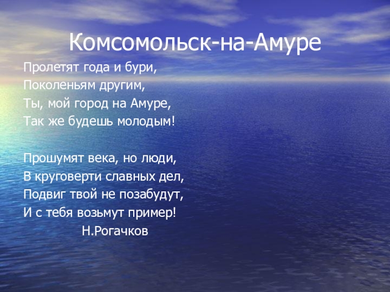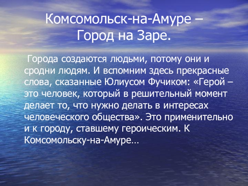 людям. И вспомним здесь прекрасные слова, сказанные Юлиусом Фучиком: «Герой – это человек, который в решительный момент делает то, что нужно делать в интересах человеческого общества». Это применительно и к городу, ставшему героическим. К Комсомольску-на-Амуре…