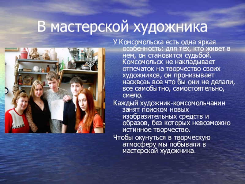кто живет в нем, он становится судьбой. Комсомольск не накладывает отпечаток на творчество своих художников, он пронизывает насквозь все что бы они не делали, все самобытно, самостоятельно, смело.