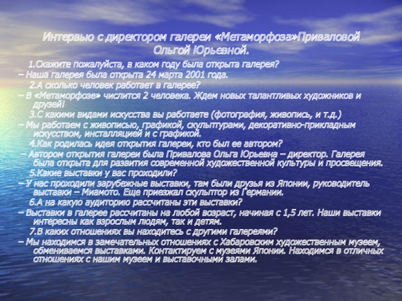 Слайд 13Интервью с директором галереи «Метаморфоза»Приваловой Ольгой Юрьевной.