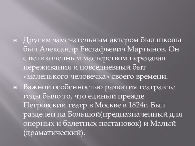 Слайд 8Другим замечательным актером был школы был Александр Евстафьевич Мартынов. Он с
