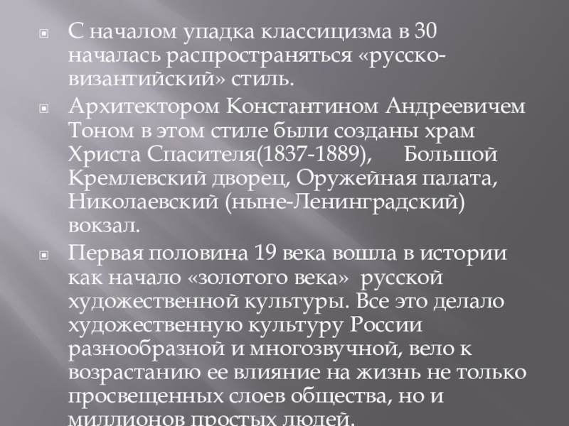 Андреевичем Тоном в этом стиле были созданы храм Христа Спасителя(1837-1889), Большой Кремлевский дворец, Оружейная палата, Николаевский (ныне-Ленинградский) вокзал.