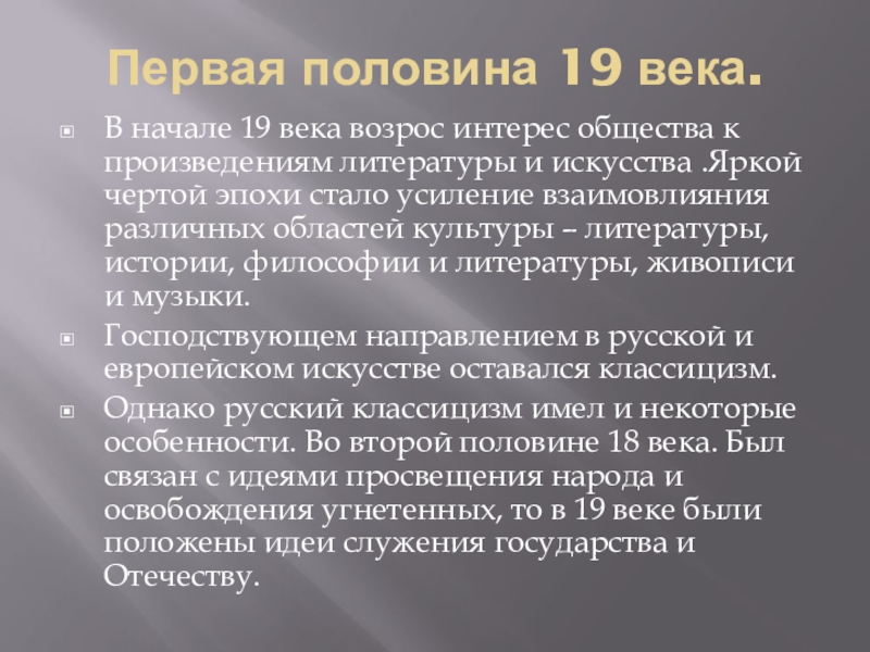 Однако русский классицизм имел и некоторые особенности. Во второй половине 18 века. Был связан с идеями просвещения народа и освобождения угнетенных, то в 19 веке были положены идеи служения государства и Отечеству.