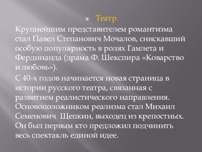 С 40-х годов начинается новая страница в истории русского театра, связанная с развитием реалистического направления. Основоположником реализма стал Михаил Семенович Щепкин, выходец из крепостных. Он был первым кто предложил подчинить весь спектакль единой идее.