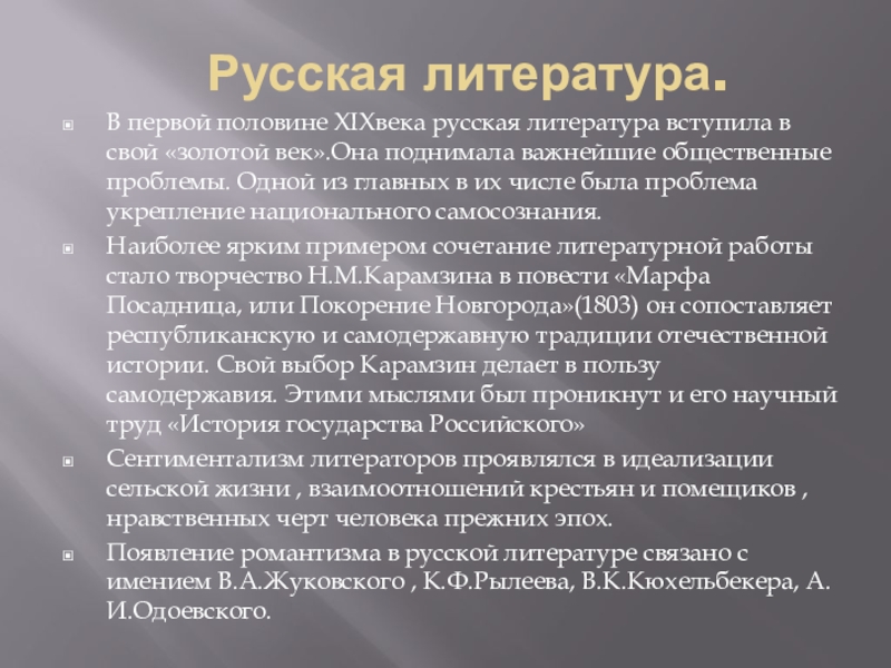 В первой половине XIXвека русская литература вступила в свой «золотой