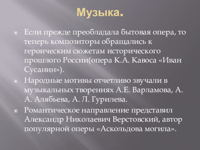 Романтическое направление представил Александр Николаевич Верстовский, автор популярной оперы «Аскольдова могила».