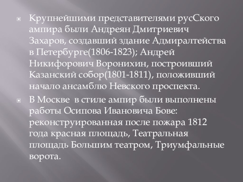 Слайд 14Крупнейшими представителями русСкого ампира были Андреян Дмитриевич Захаров, создавший здание Адмиралтейства