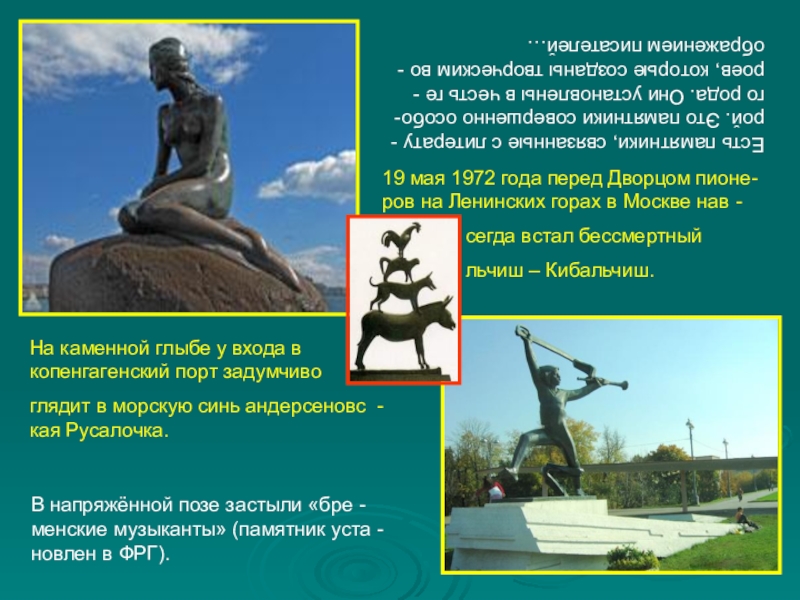 В напряжённой позе застыли «бре - менские музыканты» (памятник уста - новлен в ФРГ).