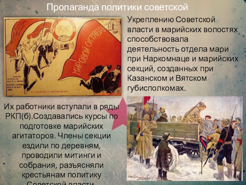 Их работники вступали в ряды РКП(б).Создавались курсы по подготовке марийских агитаторов. Члены секции ездили по деревням, проводили митинги и собрания, разъясняли крестьянам политику Советской власти.