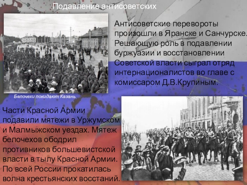 Части Красной Армии подавили мятежи в Уржумском и Малмыжском уездах. Мятеж белочехов ободрил противников большевистской власти в тылу Красной Армии. По всей России прокатилась волна крестьянских восстаний.