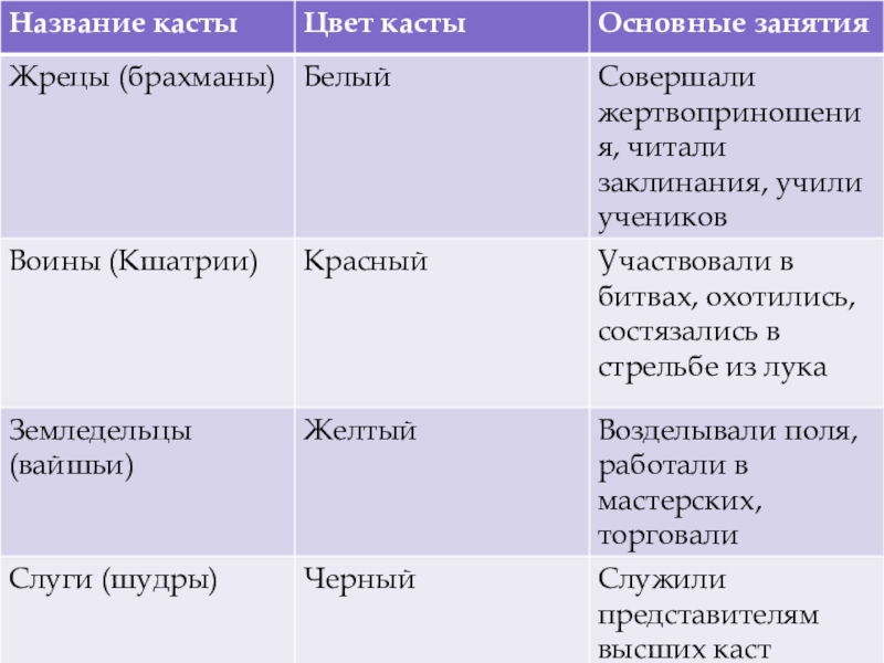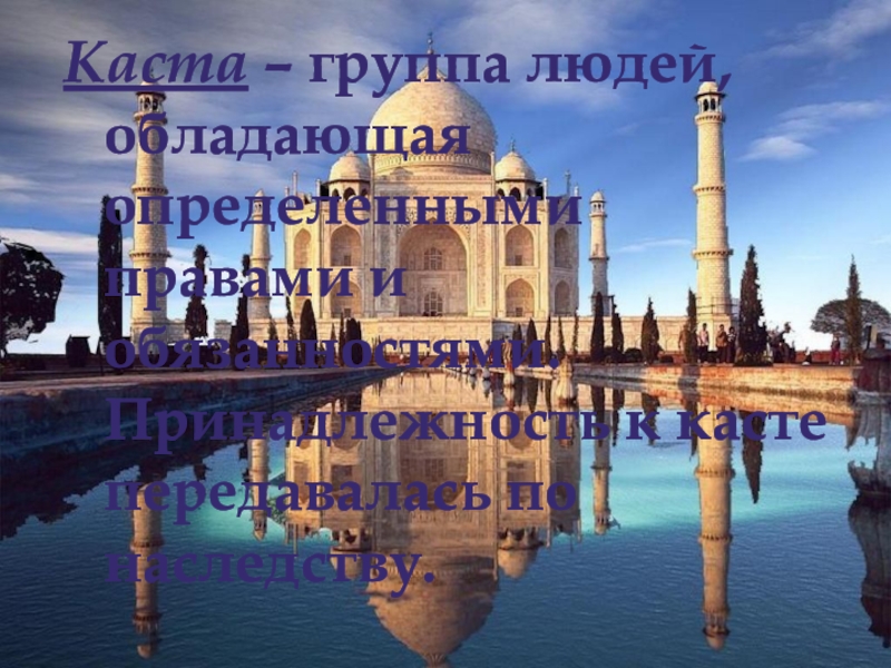 Каста – группа людей, обладающая определенными правами и обязанностями. Принадлежность к касте передавалась по наследству.