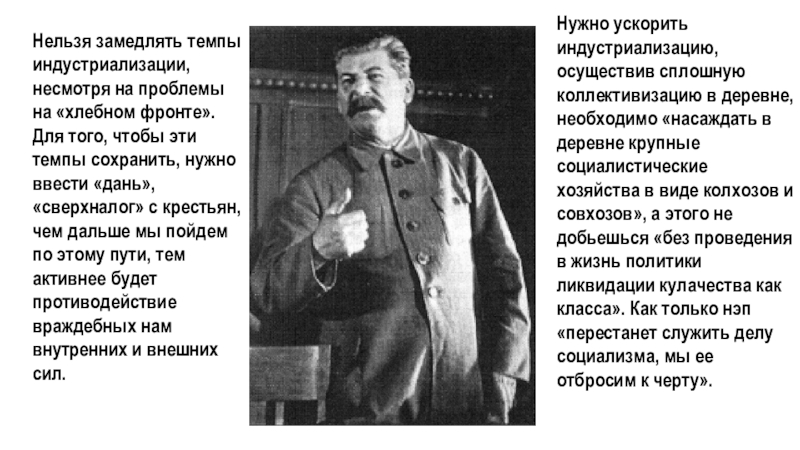 Нужно ускорить индустриализацию, осуществив сплошную коллективизацию в деревне, необходимо «насаждать в деревне крупные социалистические хозяйства в виде колхозов и совхозов», а этого не добьешься «без проведения в жизнь политики ликвидации кулачества как класса». Как только нэп «перестанет служить делу социализма, мы ее отбросим к черту».