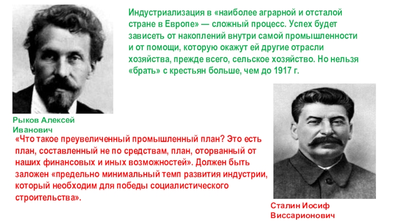 «Что такое преувеличенный промышленный план? Это есть план, составленный не по средствам, план, оторванный от наших финансовых и иных возможностей». Должен быть заложен «предельно минимальный темп развития индустрии, который необходим для победы социалистического строительства».