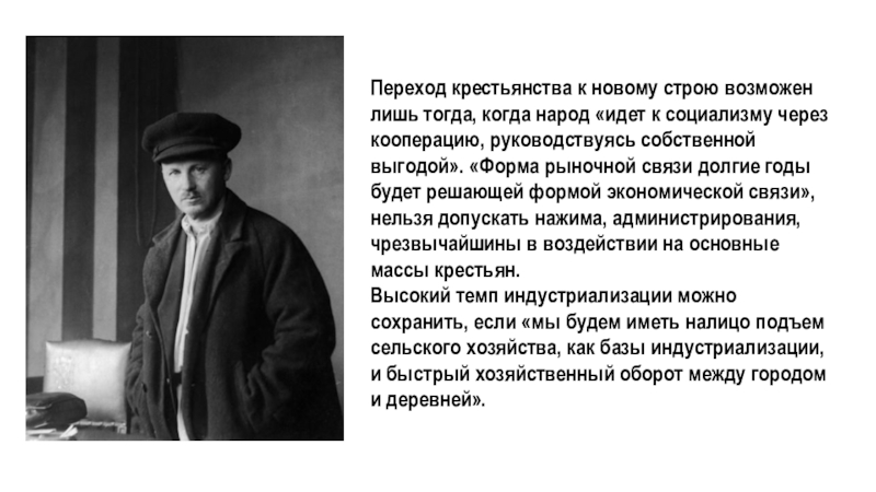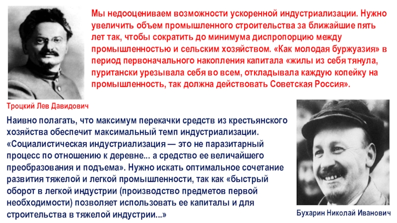 Наивно полагать, что максимум перекачки средств из крестьянского хозяйства обеспечит максимальный темп индустриализации. «Социалистическая индустриализация — это не паразитарный процесс по отношению к деревне... а средство ее величайшего преобразования и подъема». Нужно искать оптимальное сочетание развития тяжелой и легкой промышленности, так как «быстрый оборот в легкой индустрии (производство предметов первой необходимости) позволяет использовать ее капиталы и для строительства в тяжелой индустрии...»