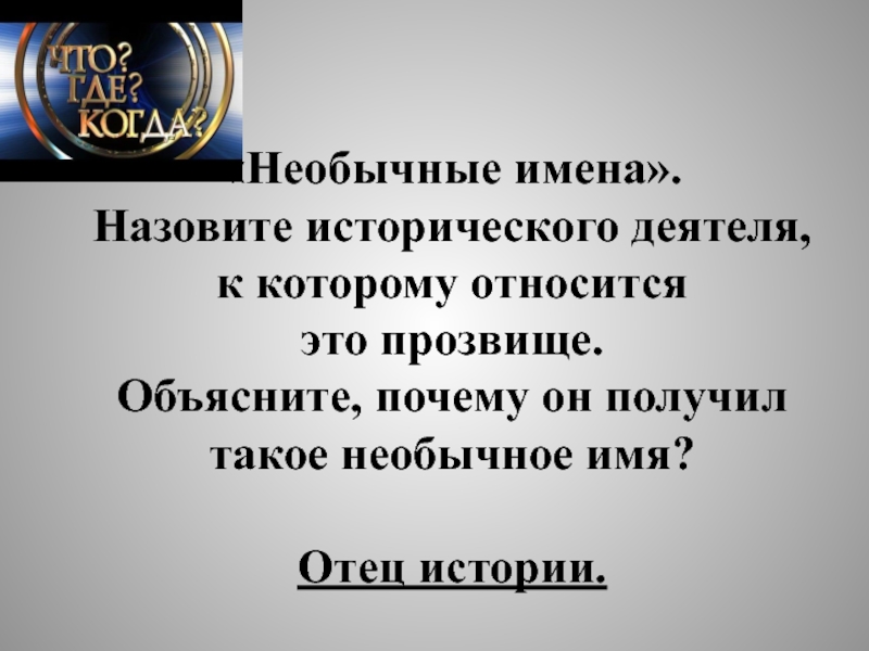 Слайд 17«Необычные имена». Назовите исторического деятеля, к которому относится это прозвище. Объясните,