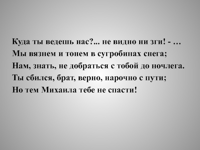 Куда ты ведешь нас?... не видно ни зги! - …Мы вязнем и тонем в сугробинах снега;Нам, знать,