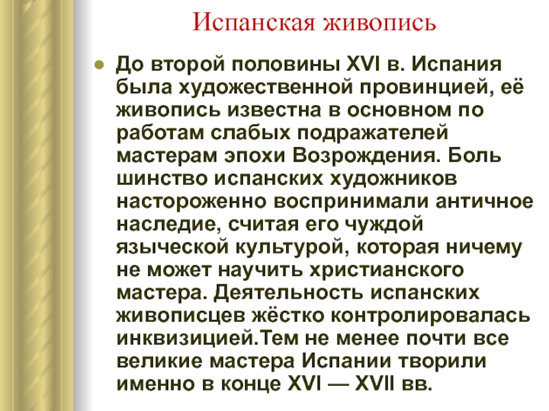 живопись известна в основном по работам слабых подражателей мастерам эпохи Возрождения. Большинство испанских художников настороженно воспринимали античное наследие, считая его чуждой языческой культурой, которая ничему не может научить христианского мастера. Деятельность испанских живописцев жёстко контролировалась инквизицией.Тем не менее почти все великие мастера Испании творили именно в конце XVI — XVII вв.