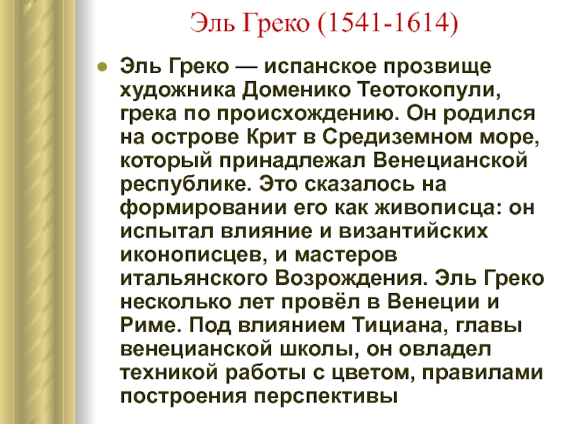 грека по происхождению. Он родился на острове Крит в Средиземном море, который принадлежал Венецианской республике. Это сказалось на формировании его как живописца: он испытал влияние и византийских иконописцев, и мастеров итальянского Возрождения. Эль Греко несколько лет провёл в Венеции и Риме. Под влиянием Тициана, главы венецианской школы, он овладел техникой работы с цветом, правилами построения перспективы