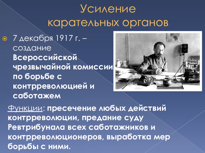 Функции: пресечение любых действий контрреволюции, предание суду Ревтрибунала всех саботажников и контрреволюционеров, выработка мер борьбы с ними.
