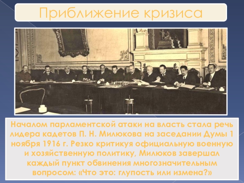 Началом парламентской атаки на власть стала речь лидера кадетов П. Н. Милюкова на заседании Думы 1 ноября 1916 г. Резко критикуя официальную военную и хозяйственную политику, Милюков завершал каждый пункт обвинения многозначительным вопросом: «Что это: глупость или измена?»