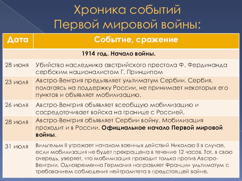 Австро-Венгрия предъявляет ультиматум Сербии. Сербия, полагаясь на поддержку России, не принимает некоторых его пунктов и объявляет мобилизацию.
